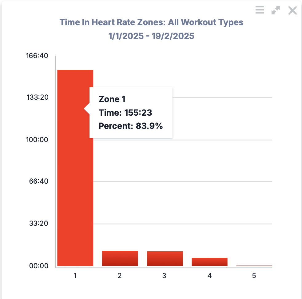 Katarzyna Solinska – Training Camp HR Distribution Based on the 5-Zone Model (January 1 to February 19, 2025), Leading Up to Trans Gran Canaria 82 km on February 22.